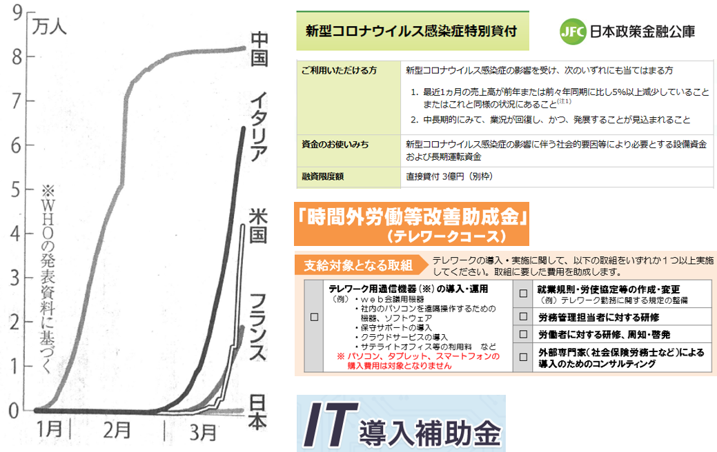 日本政府も新型コロナウィルスによる経済停滞を避けるため、実質的無利子・無担保融資「新型コロナウィルス感染症特別貸付」や「時間外労働等改善補助金テレワークコース」などを展開している。東京都でも「事業継続緊急対策(テレワーク)助成金」で250万円の助成をおこなっている。更に4月以降で「IT導入補助金」など生産性向上と絡めて、新たな交付金の可能性もでてきた。