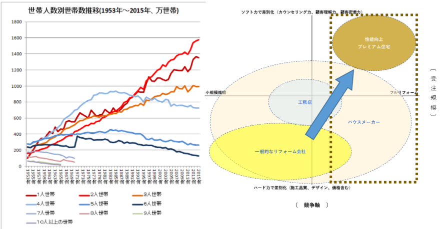新築住宅事業とリノベーション事業は、既存住宅と既存生活者の有無によりビジネスのやり方が大きく異なります。世帯人数は1人世帯や2人世帯が年々上昇していますが、世帯構成は高齢化により大きく変化してきています。80歳代と50歳代の親子が同居する8050問題など多様なライフスタイルに対応することが求められ、カウンセリングできる商談力が求められます。ご興味のある方は無料の下記説明会にご参加ください。