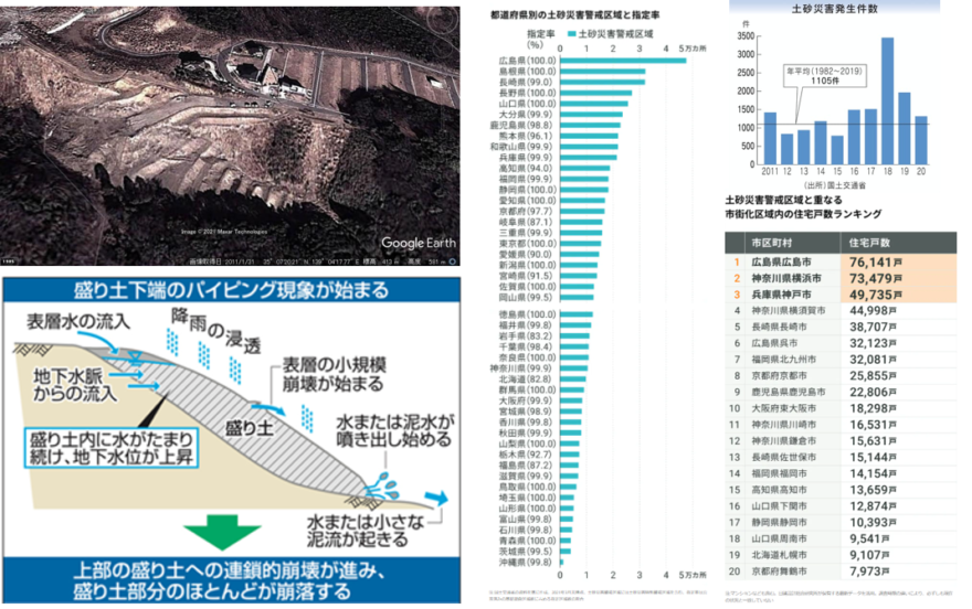 7月3日に突然被災した熱海伊豆山土砂災害は、線状降水帯による48時間で321mmの降水量(網代観測)がキッカケであるが、実はその裏には違法な残土処理があったことが伝えられている。静岡県土採取規制条例に基づいて2007年3月熱海市に盛り土の届け出書(面積1ヘクタール未満、量約3万6300立方メートル)が提出されたが、盛り土の高さは届け出の15メートルを大幅に上回る52メートルまで嵩上げされて、5万5500立方メートル(2011/1/31Google Earth写真)になっていた。水抜き排水路を設けずに沢を埋められており、上流尾根部分を整地したことにより沢への流水が増えて、パイピング現象が発生して土砂災害になったと考察されている。雨水が集まる分水嶺で囲まれたエリアを『流域』と呼ぶが、自分の住む流域の上流にどんなリスクが潜んでいるか意識することは重要である。