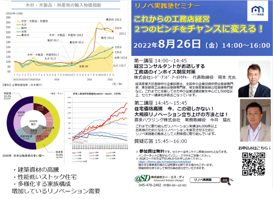 そこで『これからの工務店経営 2つのピンチをチャンスに変える!』リノベ実践塾セミナーを8月26日(金)にオンライン開催することにしました。「生き残るのは、最も強い種でも最も賢い種でもなく、環境の変化に最も敏感に対応できる種なのです」進化論を唱えたダーウィンの言葉です。社会変化をいち早く察知して対応するが求められています。