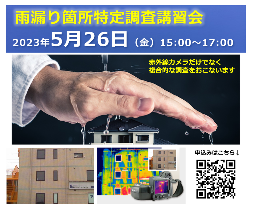 これから梅雨の季節がやってきますが、雨漏りに困っている事業者様も少なからず居るかと思います。水かけテストをおこなうものの再現できなかったり、狙いを付けて補修をおこなっても再発したり厄介なものです。このたび一般社団法人横浜市建築士事務所協会にて『雨漏り箇所特定調査講習会』を5月26日(金)に開催することになりました。