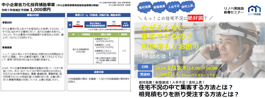 ファミリーレストランではロボットが配膳してホール人員を省人化していますし、建設現場ではドローンやリモートカメラを活用した省力化が検討されています。詳細内容がわかりましたらお伝えしていきたいと思います。ところで…住宅着工棟数が減少してきておりますが、皆さまのところでは充分な集客ができていますでしょうか。モデルハウスや見学会に集まりが減ってきたとかチラシを撒いても反響が少なくなったと感じている方向けに『新春リフォーム集客セミナー』を1月18日(木)14:00~16:00オンライン開催することになりました。効率よい集客をおこなう方法などの情報をお届けします。ぜひ、この機会にご参加していただき活用していただければと思っております。