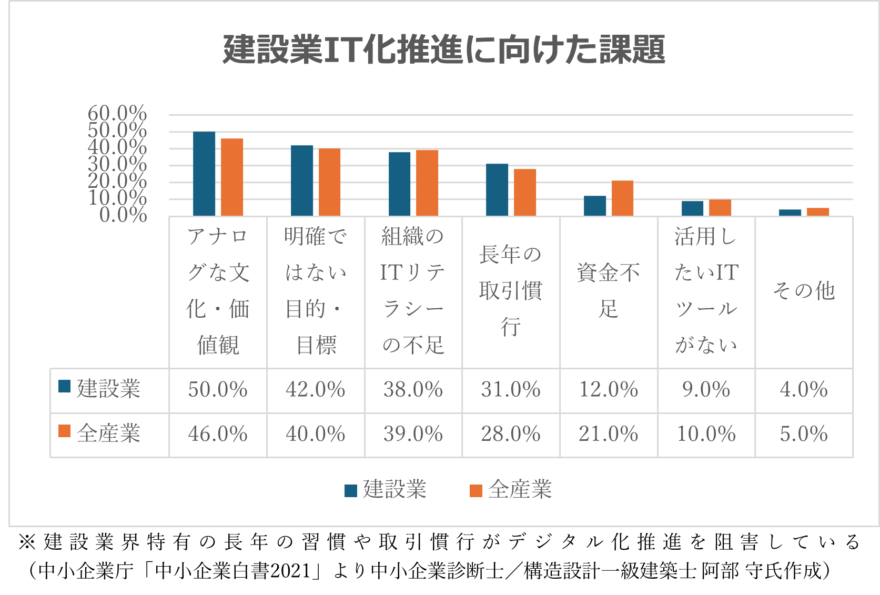特に人手不足が深刻な建設業界は、生産性の向上やビジネスモデルの変革に向けてデジタル化やDX(デジタルトランスフォーメーション)に取り組む企業が増えています。このような企業は大手が中心で、多くの中小企業は取り組みを始める段階にさえ至っていないケースが考えられます。