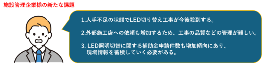 蛍光灯の廃止に伴い、施設管理企業様では新たなお悩みを持たれている方が多くいらっしゃいます。