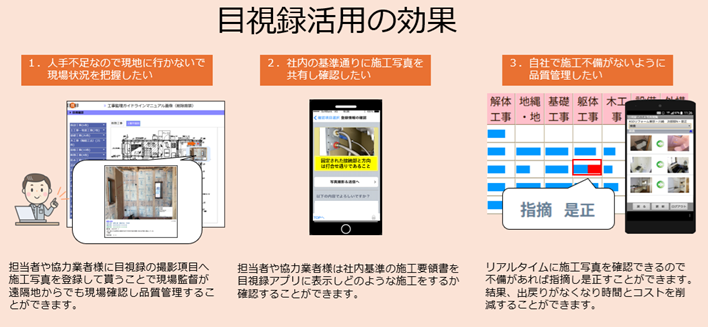 担当者や協力業者様に目視録の撮影項目へ施工写真を登録して貰うことで現場監督が遠隔地からでも現場確認し品質管理することができます。