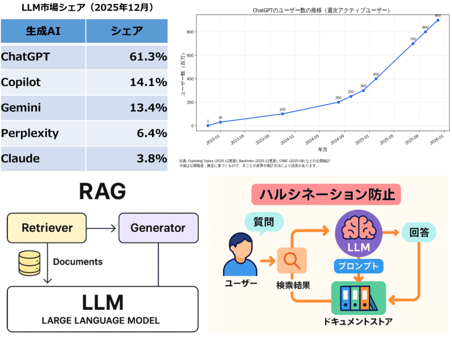 あけましておめでとうございます。2025年はどのような年だったでしょうか。2026年は午(うま)年…さらなる飛躍に向けて行動を起こすには最高の年です。今年もよろしくお願いします。2025年の流行語にノミネートされた「チャッピー」ChatGPTを若者はこう呼んでいるのだそうです。この1年間でアクティブユーザは3倍くらいに増えており、毎日使われている方も多いのではないでしょうか。何かを調べる時にGoogle検索するよりも生成AIに確認することが多くなったと思います。一方で生成AIを使い始めたもののハルシネーション(幻覚)に悩まされている方もいると思います。真偽を見極めることも必要ですし、的確な指示や質問をだす必要もでてきます。このハルシネーションを防止して自社のノウハウを確立する仕組みにRAG(Retrieval-Augmented Generation)検索拡張生成というものがあります。現在色々な実証実験をおこなっていますので、生成AIを活用した自社独自のシステム構築を検討されている方は、ぜひお気軽にご相談してください。