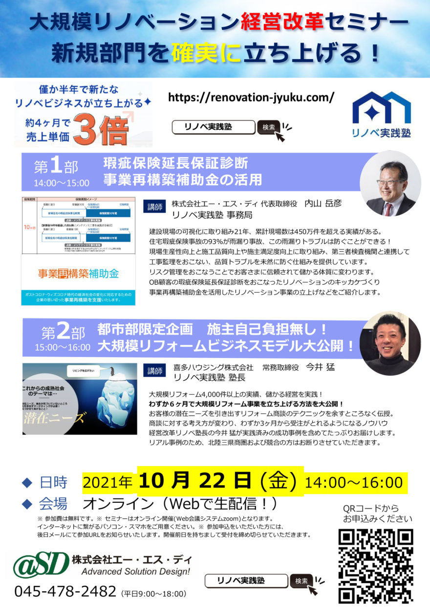 都市部限定企画 施主自己負担無し!大規模リフォームビジネスモデル大公開!